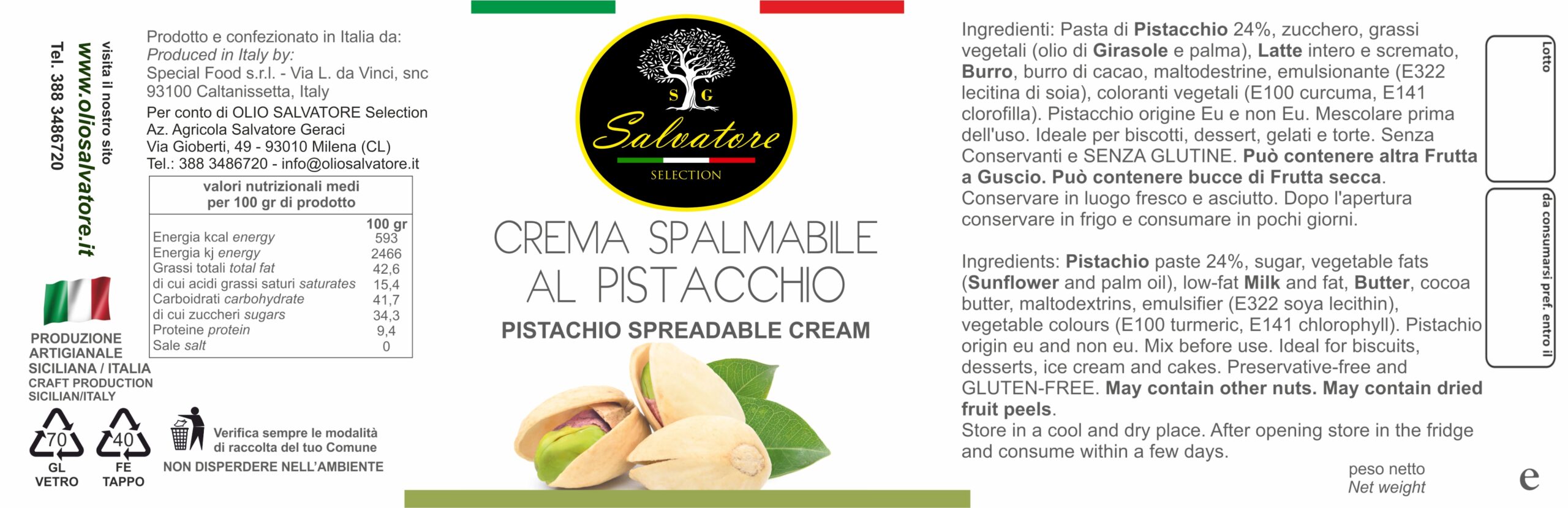 La Crema Spalmabile Dolce al Pistacchio “Olio Salvatore” è perfetta da gustare spalmata su pane, fette biscottate o brioches, come ingrediente per i nostri dolci fatti in casa, come muffin e cheesecakes, o in abbinamento a gelato o yogurt.