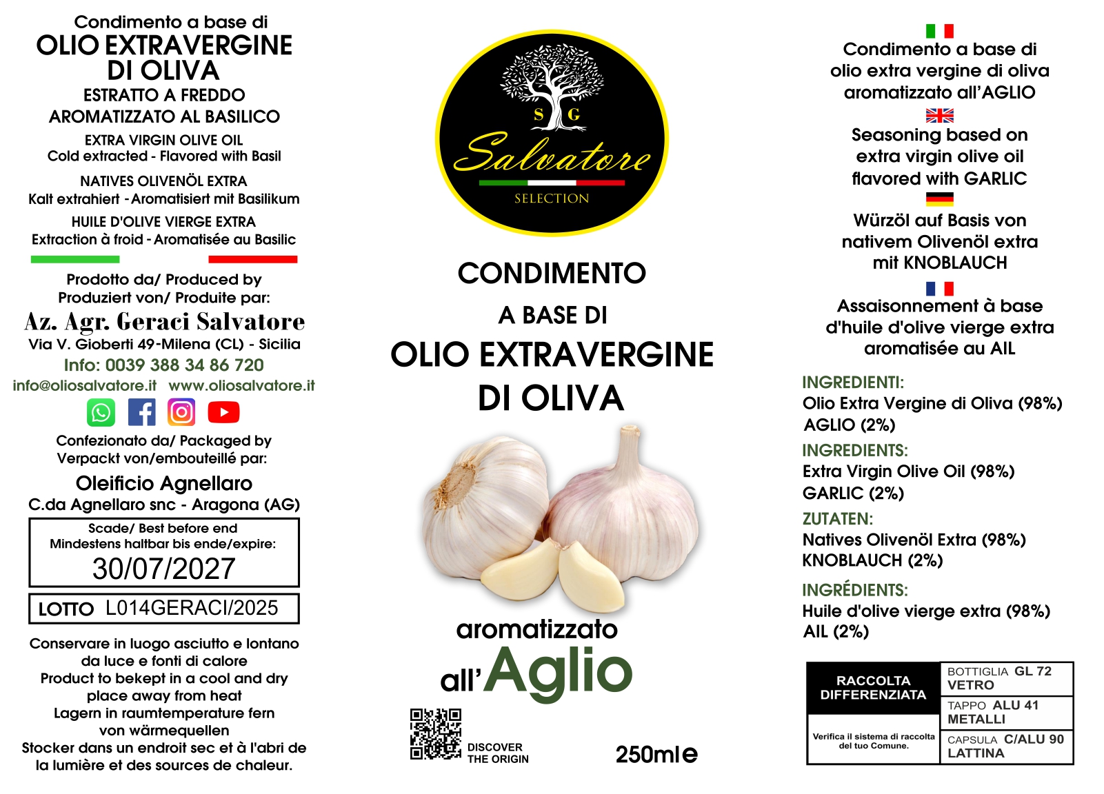Olio Aromatizzato all'Aglio 250 ml “Olio Salvatore”